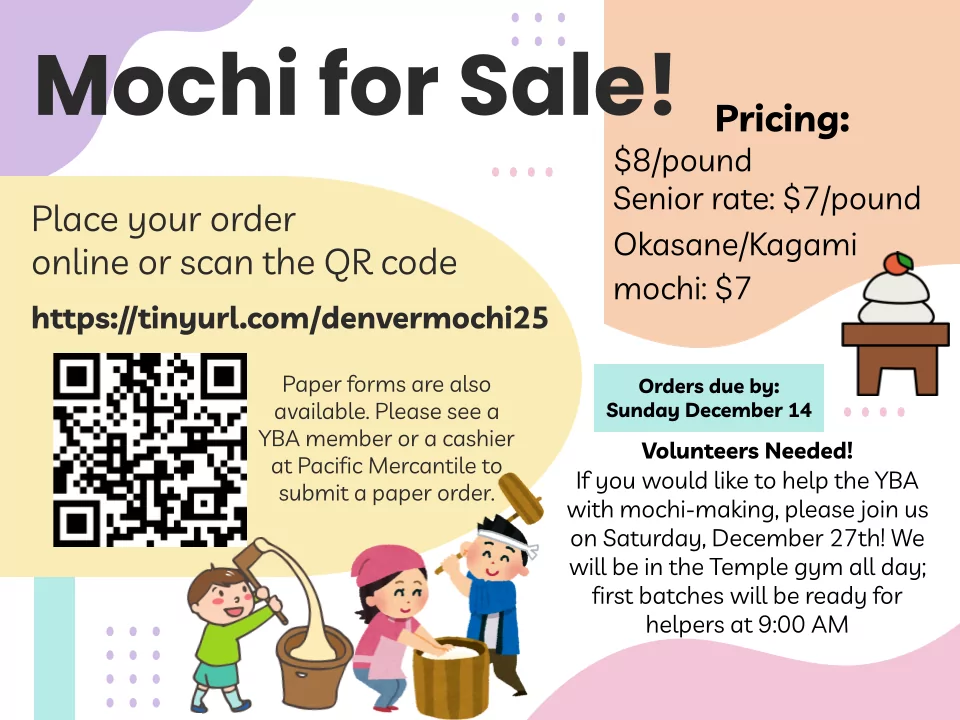 It is time to place your mochi orders! Orders are due by December 14th for pickup on December 28th. Want to help make mochi? We need you on December 27th from 9am!