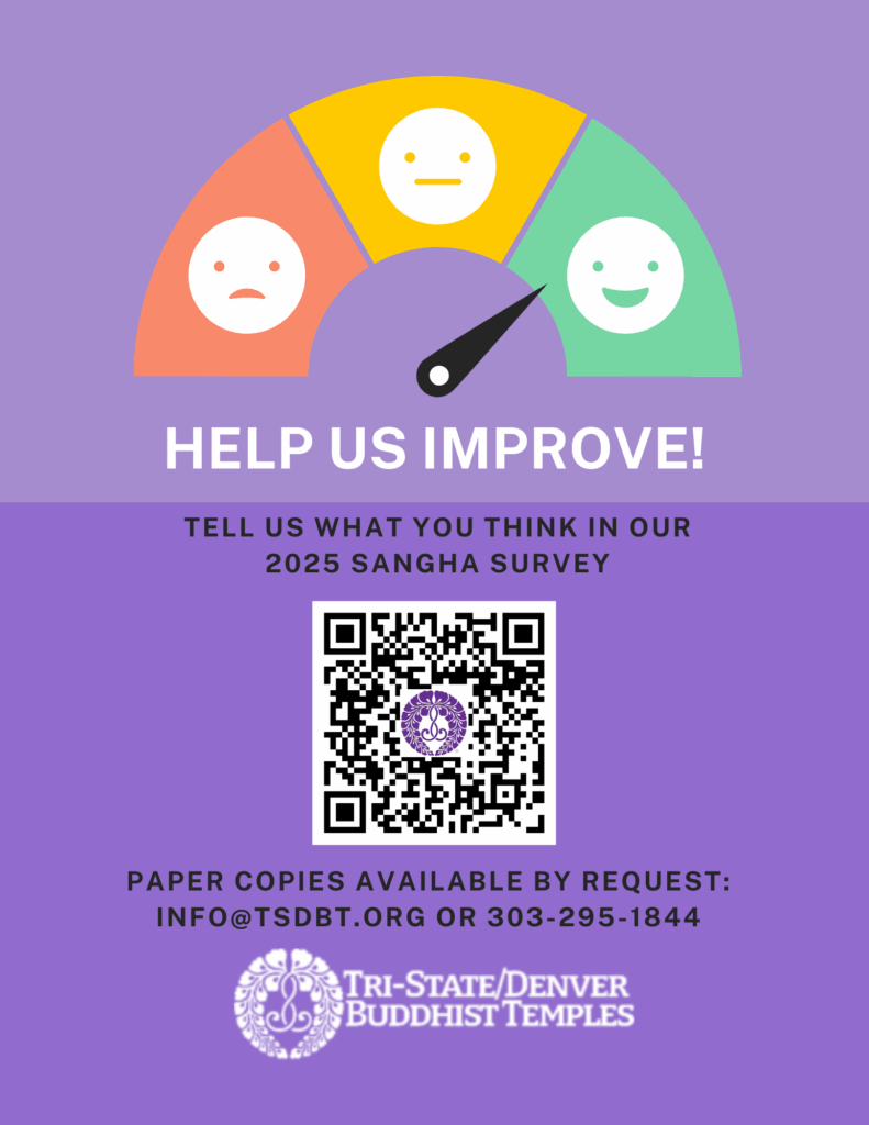 Thank you for being a part of our sangha! Please share your thoughts about the temple by December 31, 2025, to help us as we reflect and grow.